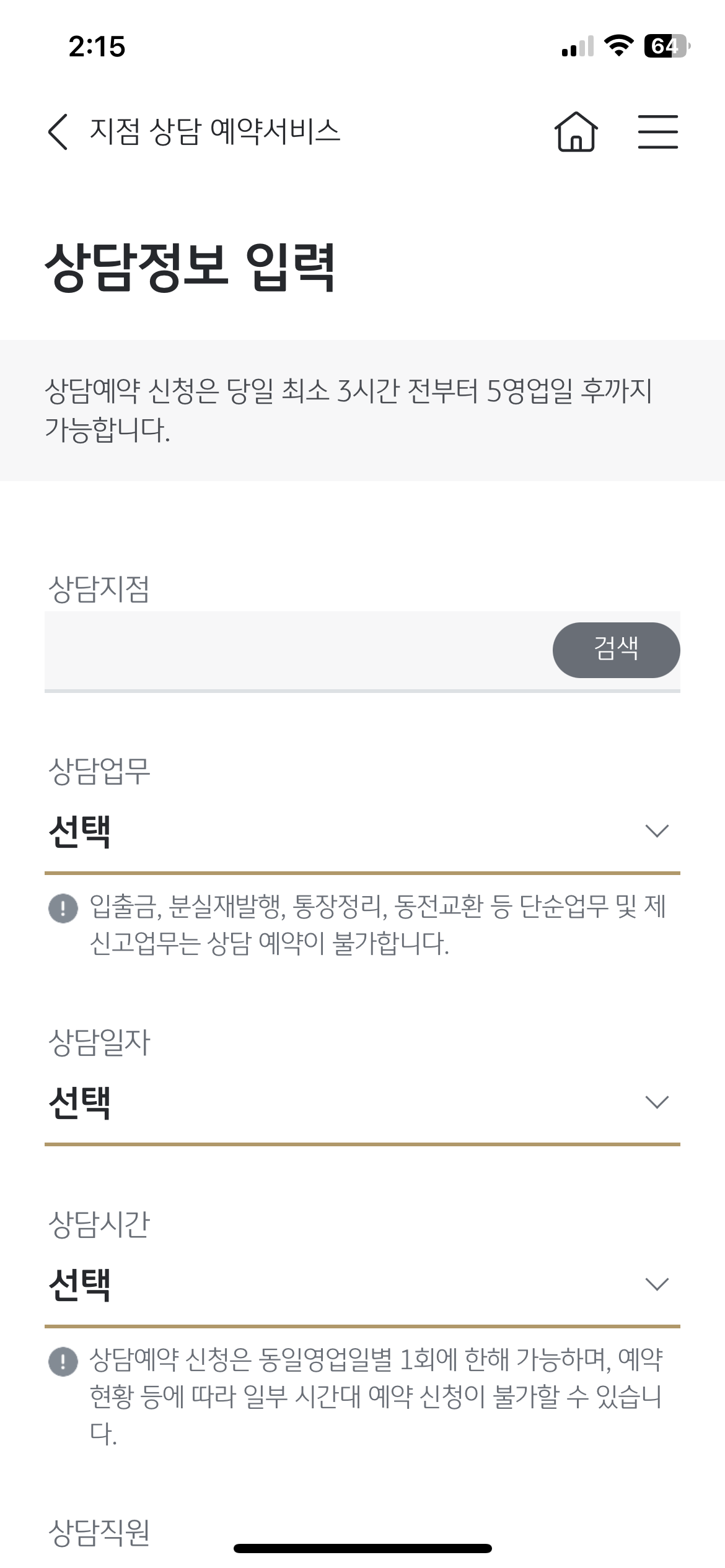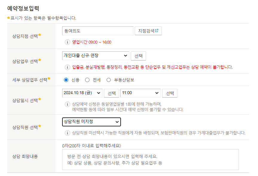 - 필요 정보 입력 : 예약 화면에서 상담을 원하는 지점, 상담 종류, 날짜와 시간을 선택합니다.