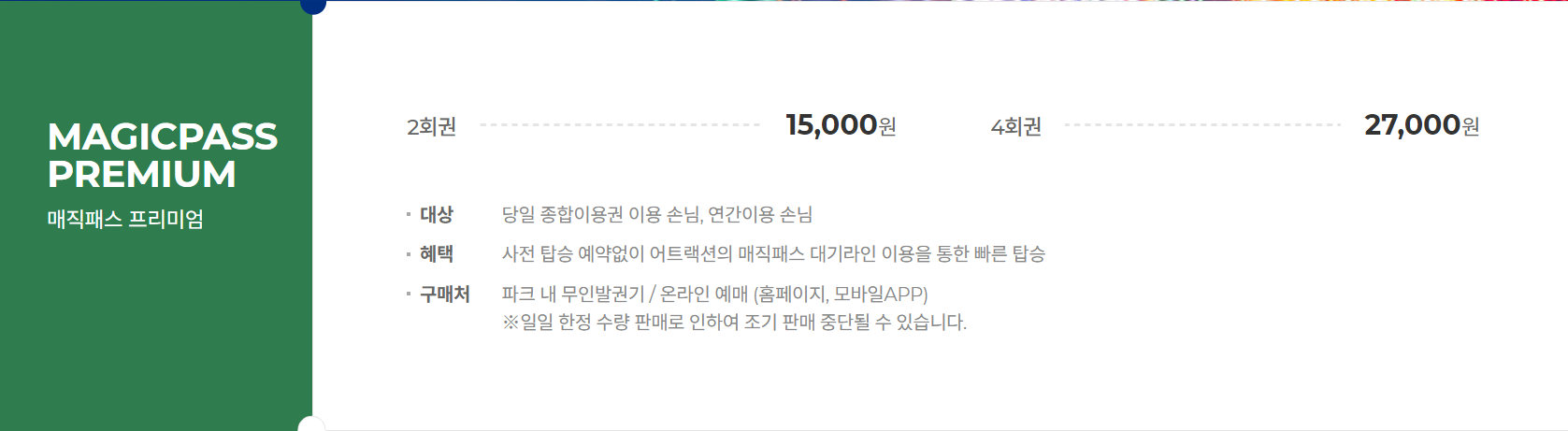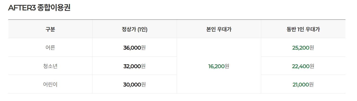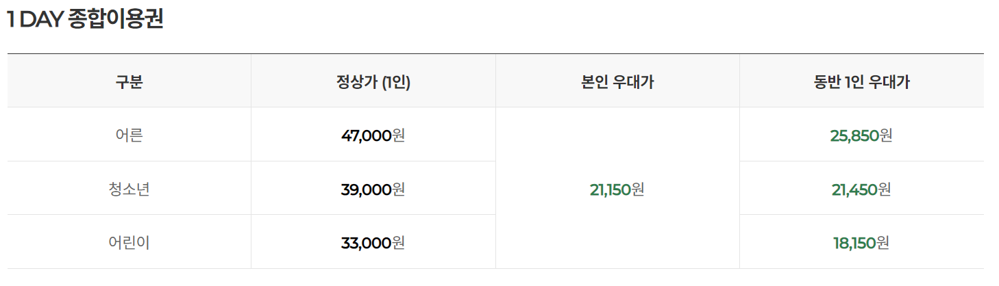 제휴카드 할인 혜택 을 이용하면 더욱 저렴하게 티켓을 구입할 수 있습니다. BC, 우리, 롯데, 신한, 국민 등의 카드사에서 할인 혜택을 제공하고 있으며, 본인은 55%, 동반 1인까지는 30%까지 할인을 받을 수 있습니다.