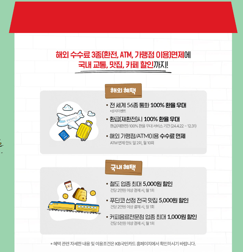 - 환율 우대 100%: 해외 가맹점에서 결제 시 발생하는 해외 결제 수수료 1.25%가 면제됩니다.