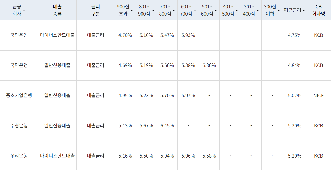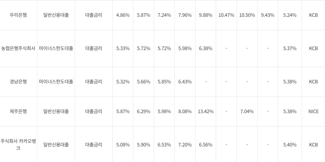 - 국민은행: 신용대출 평균 금리(금융채 6개월 기준) 5.37%