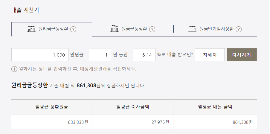 1000만 원을 1년 동아 6.14%로 원리금 균등상환을 할 경우