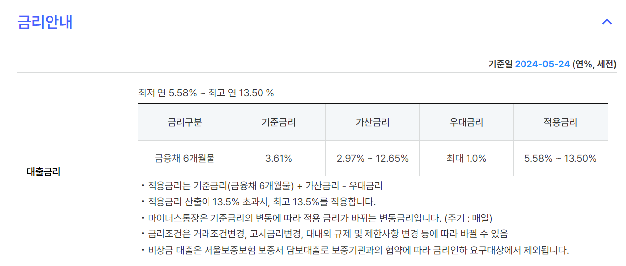대출금리는 최저 5.58 ~ 최고 13.5%입니다.