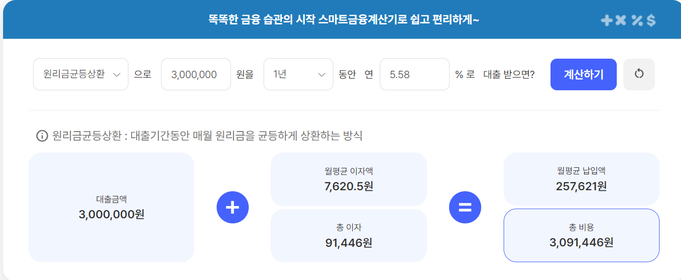 원리금 균등상환으로 1년 동안 5.58% 대출 시 월상환금액은 257,621원입니다.