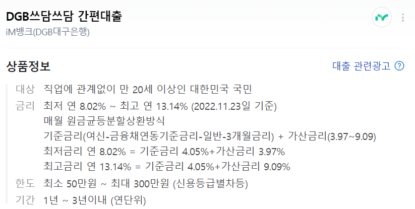 iM뱅크(DGB대구은행) DGB쓰담쓰담 간편 대출입니다.
