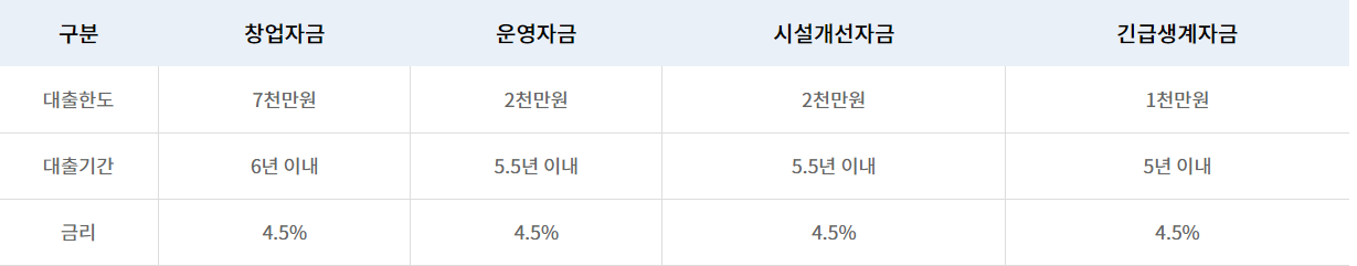 신용등급이 낮아 은행 등 제도권 금융기관에서 대출받기 어려운 금융소외계층을 대상으로 창업·운영자금 등을 무담보·무보증으로 지원하는 소액대출사업입니다. 대출한도는 창업자금의 경우 7천만 원, 운영자금 2천만 원, 시설개선자금 2천만원, 긴급생계자금 1천만 원까지 대출이 가능합니다.