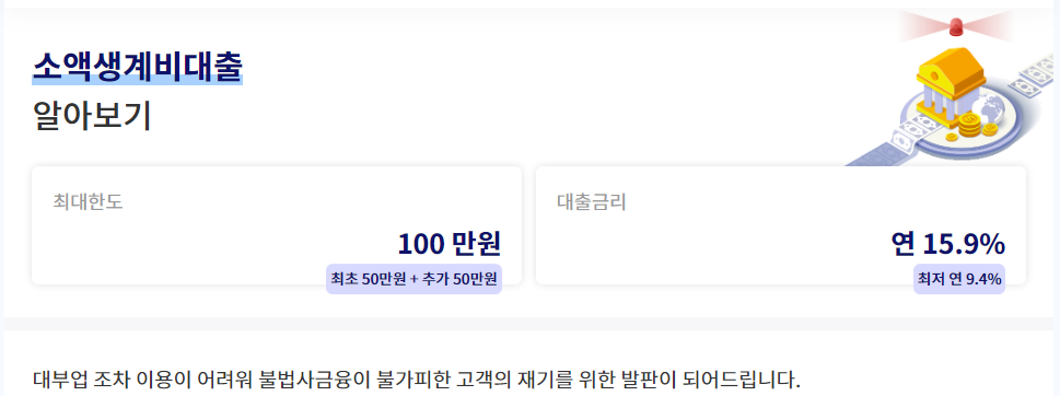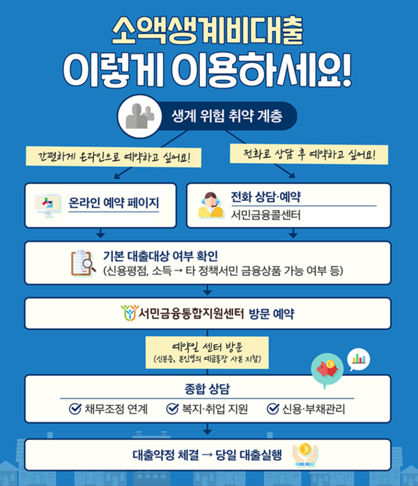 소액생계비대출은 정부에서 지원하는 대출 프로그램으로, 주로 생활비가 부족한 저소득층을 위해 마련되었습니다. 이 대출은 긴급한 상황에서 필요한 자금을 지원하여 경제적 부담을 덜어주는 역할을 합니다. 대출금액은 적지만, 필요한 순간에 큰 도움이 될 수 있습니다.
